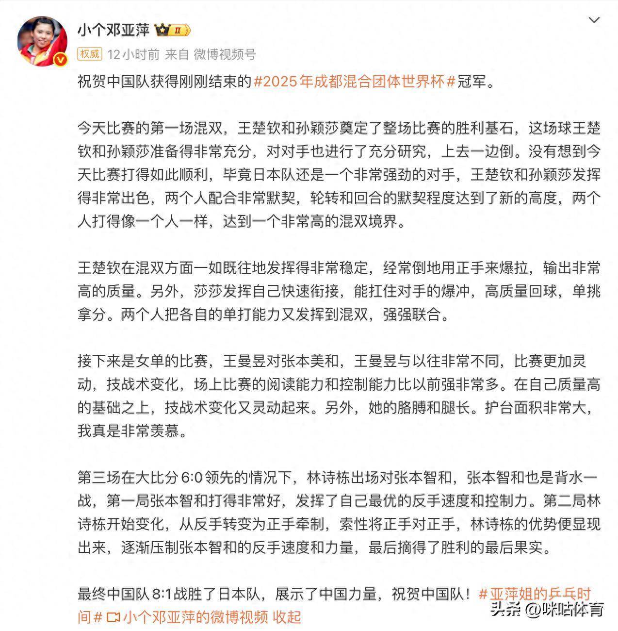 2025 成王人国外乒联羼杂团体宇宙杯决赛演出巅峰对决,中国乒乓军团不负众望,以总比分 8-1 的齐全上风横扫强敌日本队,得手斩获本届赛事冠军!赛后,乒坛名宿邓亚萍第一时辰在社媒发文祈福,盛赞中国队展现出宏大的 “中国力量”,并要点确定了王楚钦、孙颖莎等选手的高光阐发。