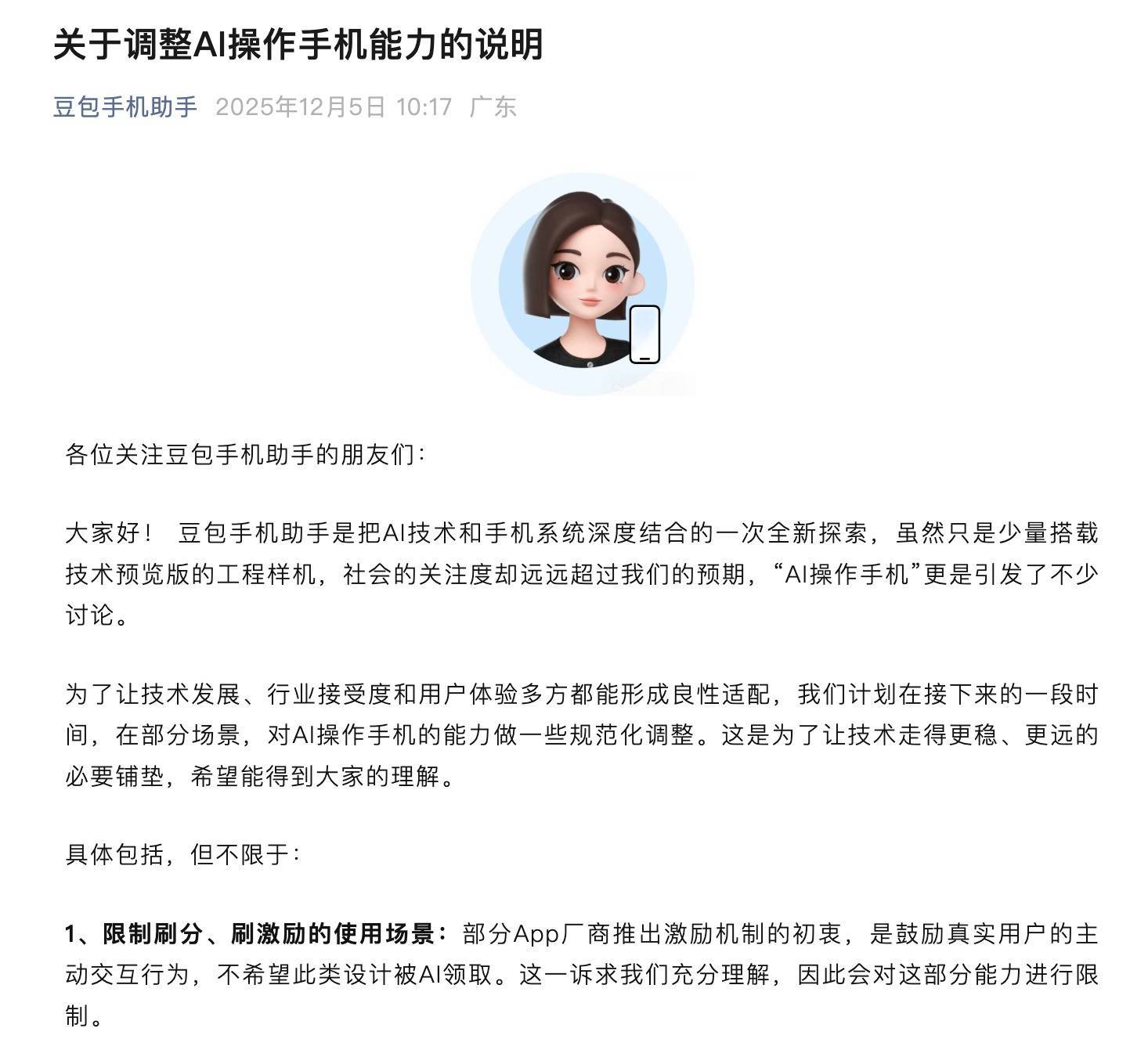 【大河财立方消息】12月5日,豆包手机助手团队发布《关于调整AI操作手机能力的说明》。