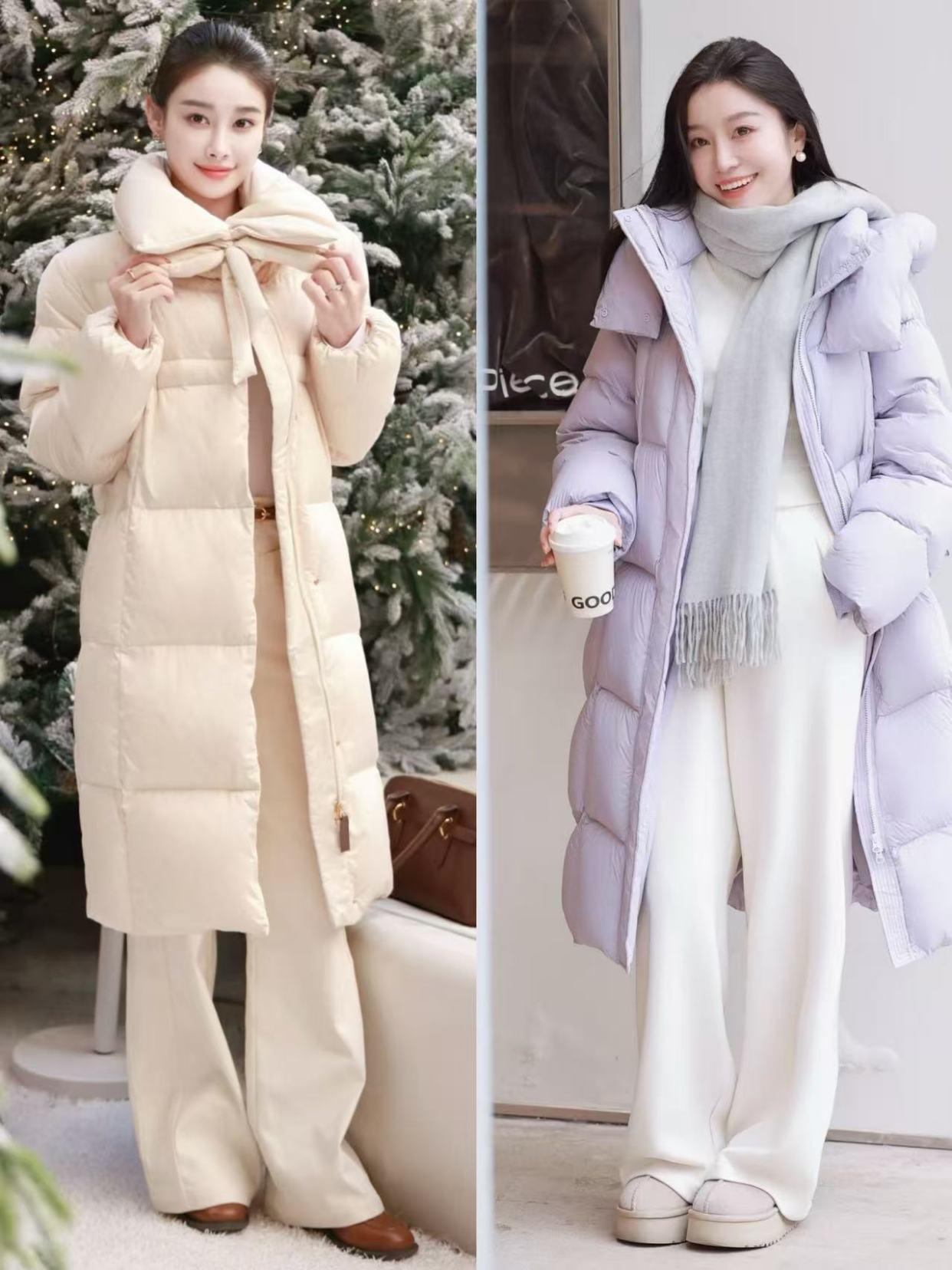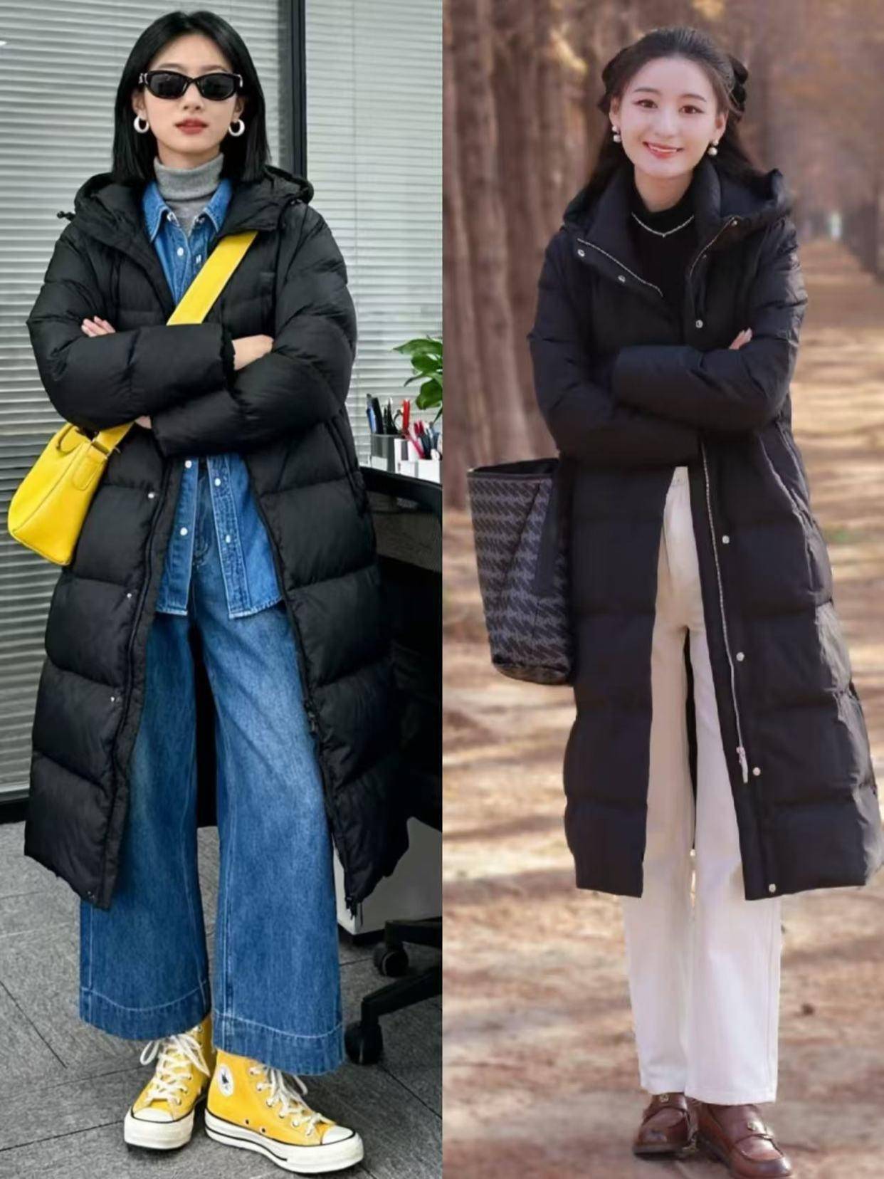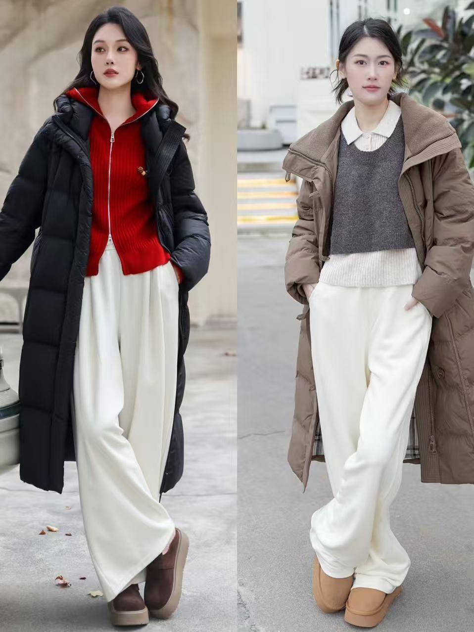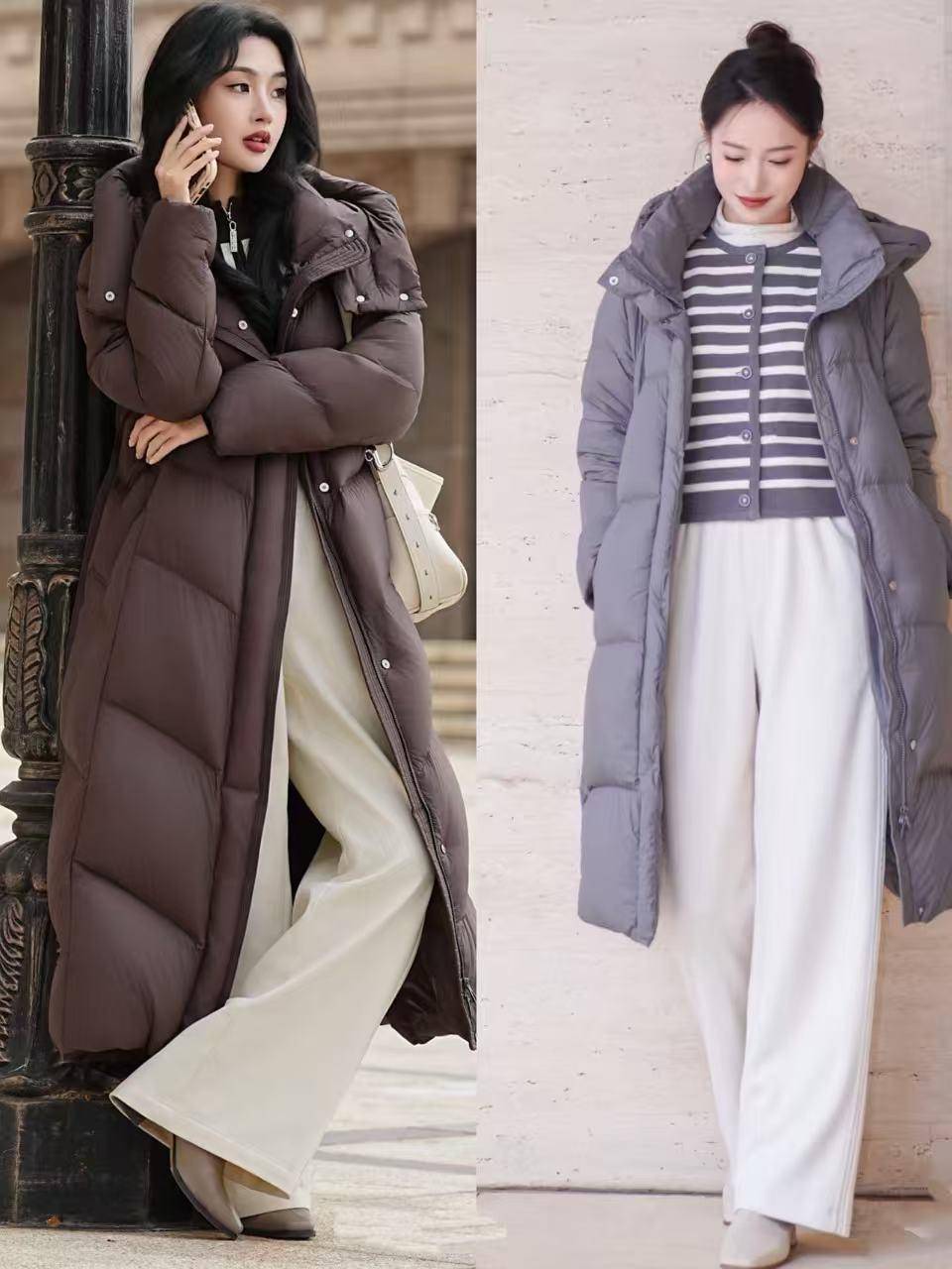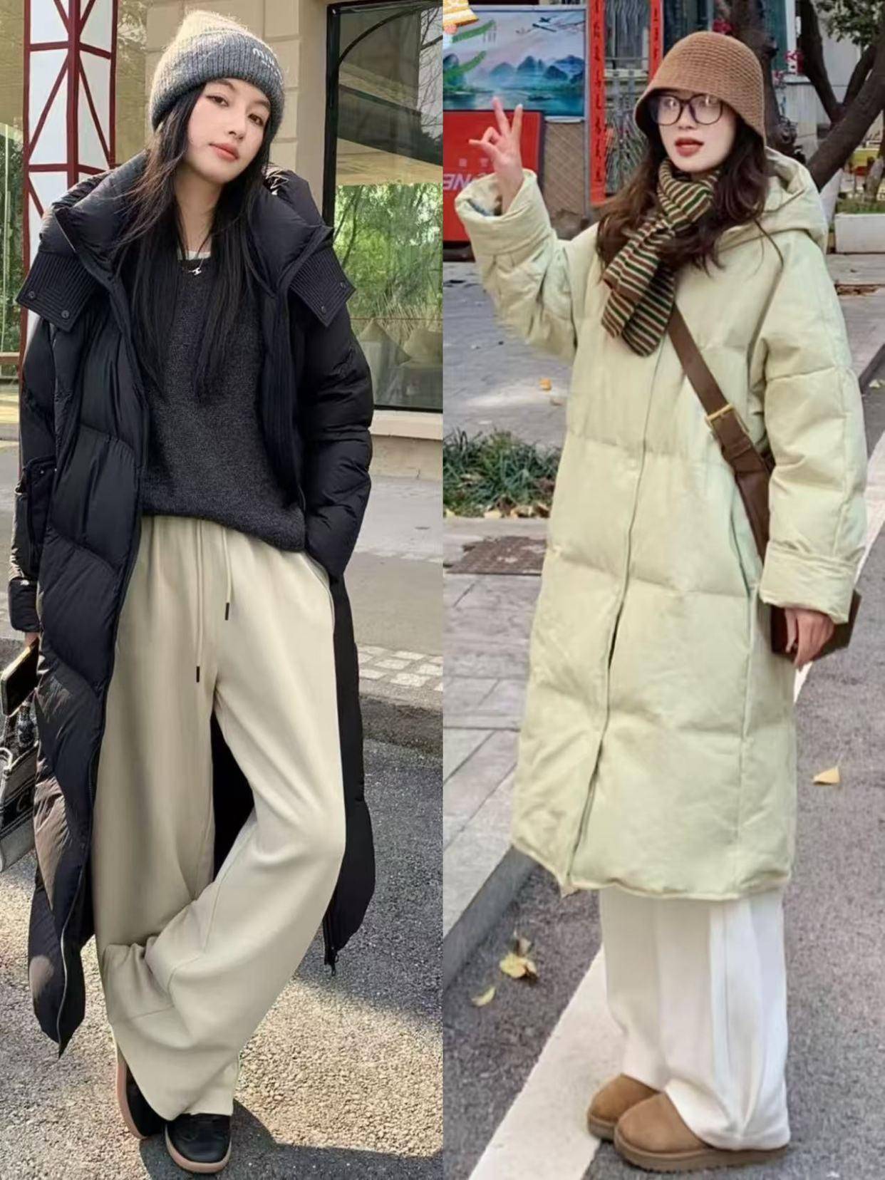 第四章节:搭配直筒裤让你御寒又自得,同期不失机尚感①:长款羽绒服搭配小白裤
