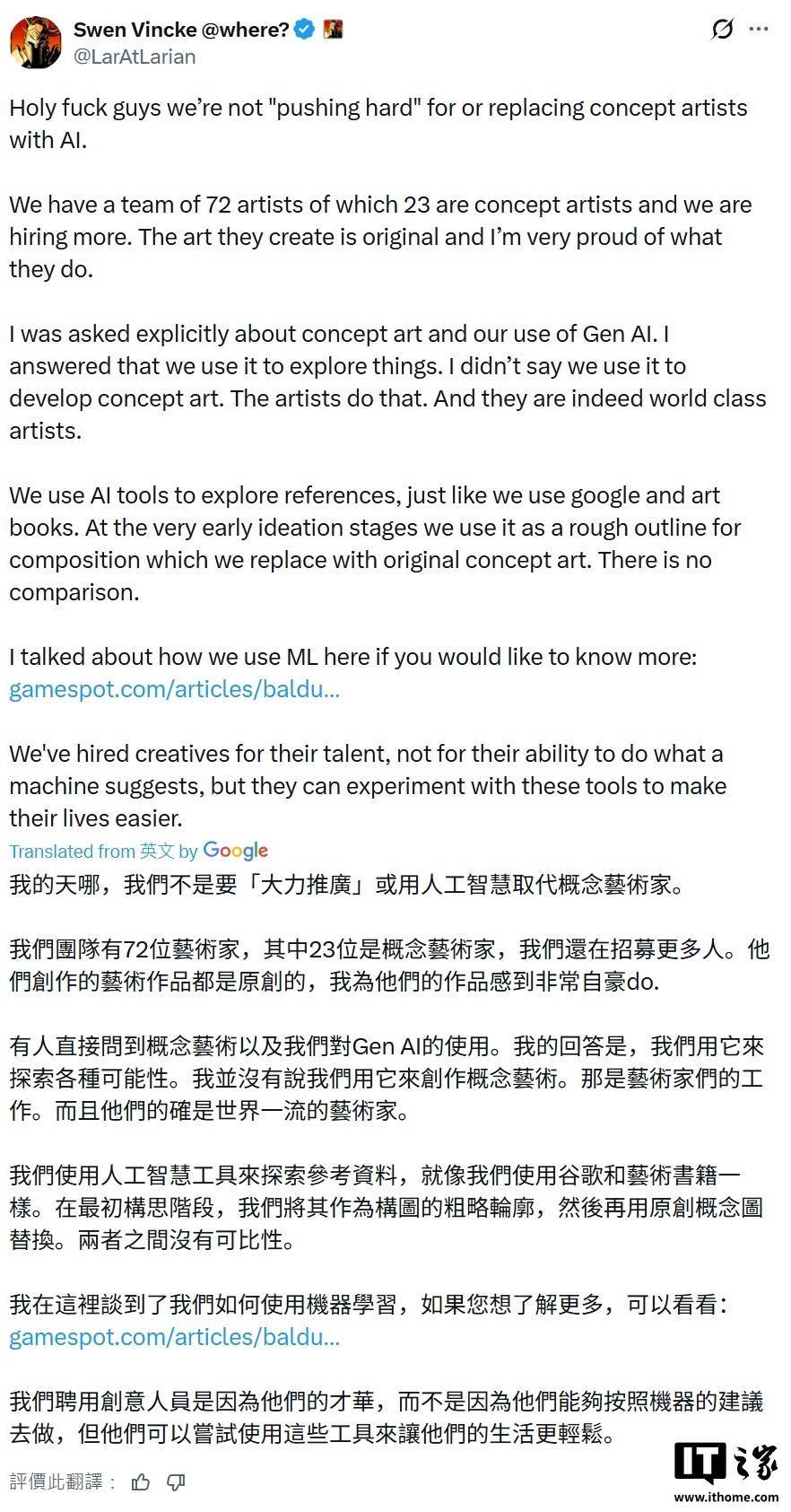 面临愈演愈烈的月旦,Swen Vincke 不得不在 X 平台作念出复兴,坚定否定“AI 替代好意思工”的说法:“诸君,咱们根柢莫得‘随便鞭策’AI,更没灵验它来取代好意思工。咱们当今有 72 名好意思术东谈主员,其中 23 东谈主王人是成见好意思术师,而且还在握续招聘。他们创造的作品王人是原创的,我为此感到自恃”。