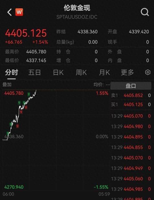 12月22日,外洋金价。法子13时30分,COMEX黄金粉碎4430好意思元关隘,最高涉及4437.3好意思元/盎司,最大涨幅1.14%;伦敦现货黄金粉碎4400好意思元大关,最高涉及4405.78好意思元/盎司,最大涨幅1.55%,创下历史新高。