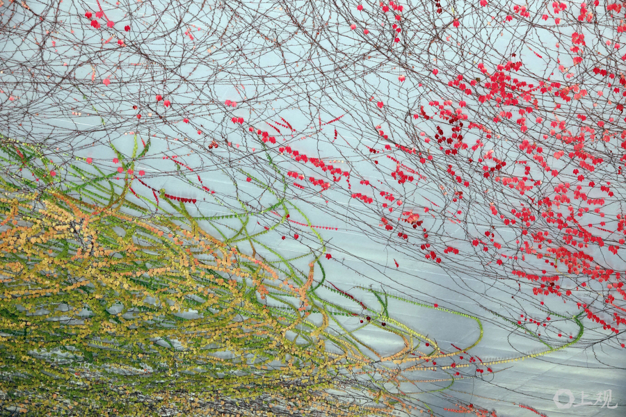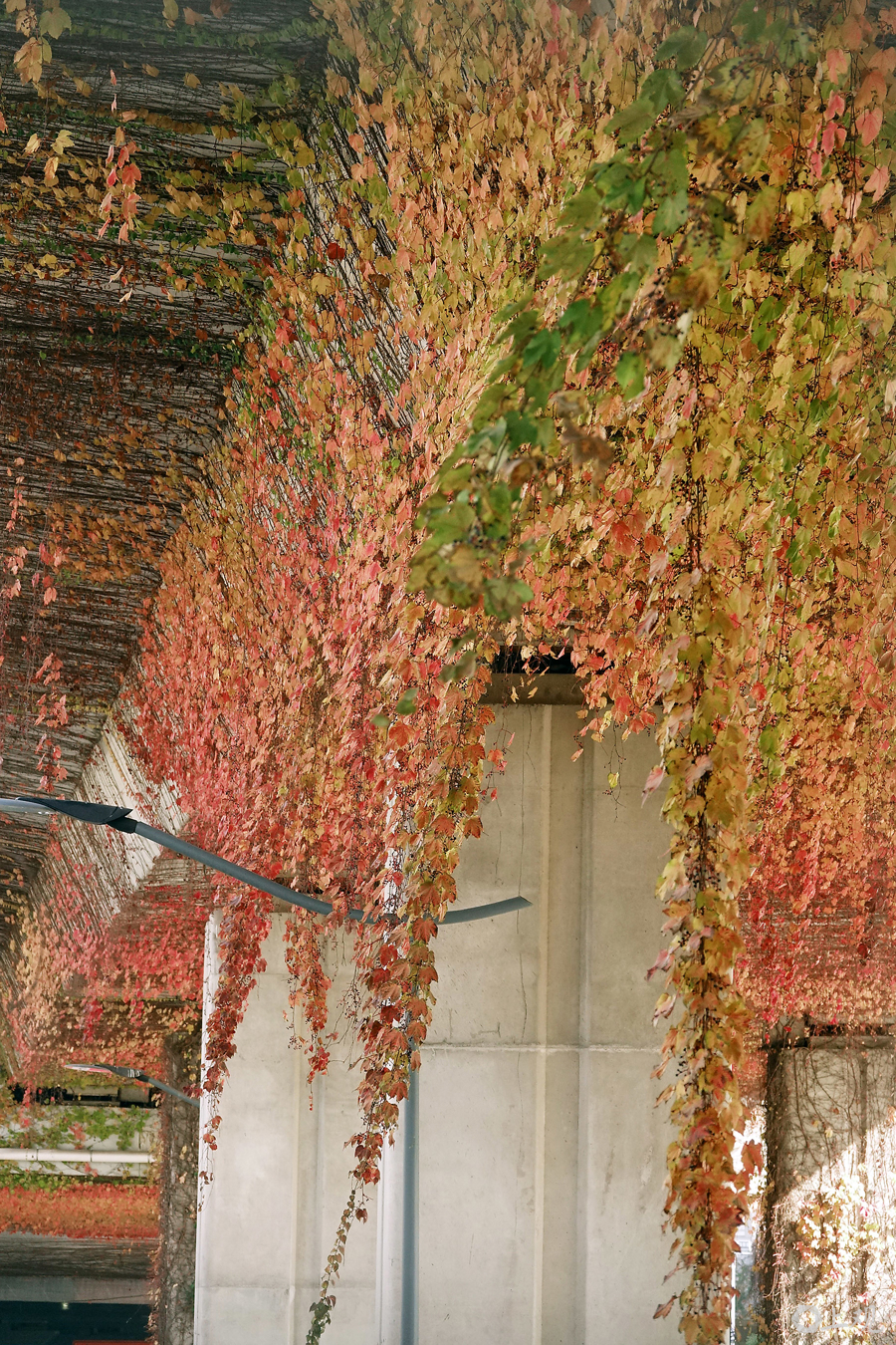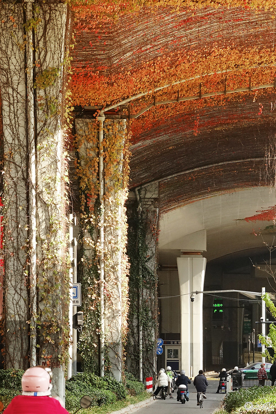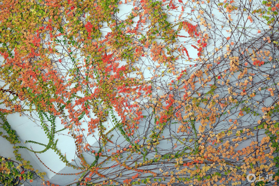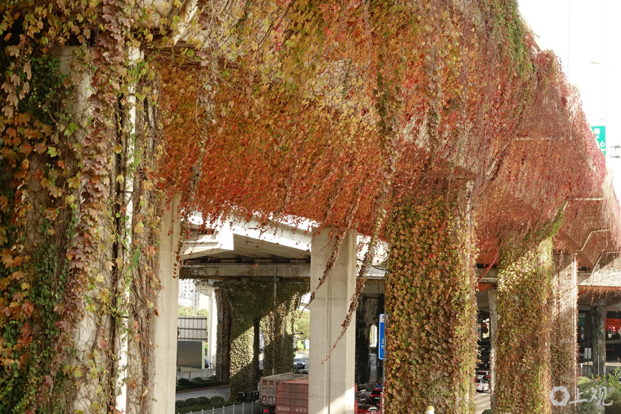 12月20日上昼,申城犹如小阳春,气温接近20℃。在崧泽高架桥下,绿的、黄的、橙的、红的爬山虎等爬藤植物勾画出一个现象宜人的春天,市民仿佛闯入了童话宇宙。