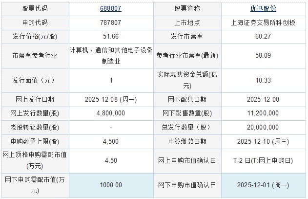 优迅股份2025年12月5日披露的首次公开发行股票并在科创板上市发行公告显示,按本次发行价格51.66元/股和2,000.00万股的新股发行数量计算,若本次发行成功,预计公司募集资金总额103,320.00万元,扣除发行费用(不含增值税)10,551.17万元,预计募集资金净额为92,768.83万元(如有尾数差异,为四舍五入所致)。