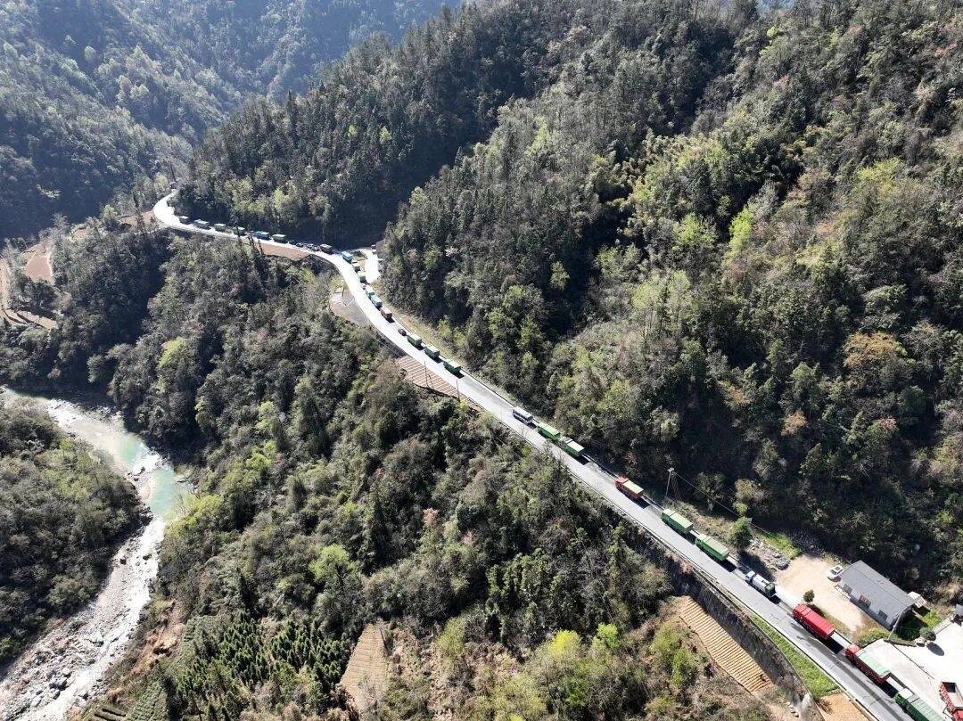 ▼承担当地磷矿运载的货车行驶在宜昌夷陵区雾殷公路上,排成了长龙。图/视觉中国
