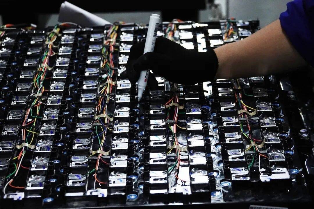 ▼广西柳州华霆新能源技艺有限公司能源电板坐褥车间,工东说念主在对新能源汽车能源电板进行激光焊合检查。图/视觉中国